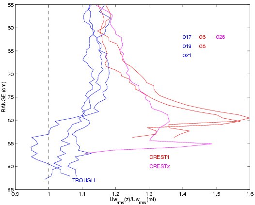 Figure 1: Vertical profiles of uwrms, the root-mean-square wave-band velocity orthogonal to the ripple crests in the 1999 experiment at LEO-15, normalized by the rms velocity at 35 cm range. Profiles are over the leading and trailing crests and intervening trough of a single ripple migrating beneath the sensor.